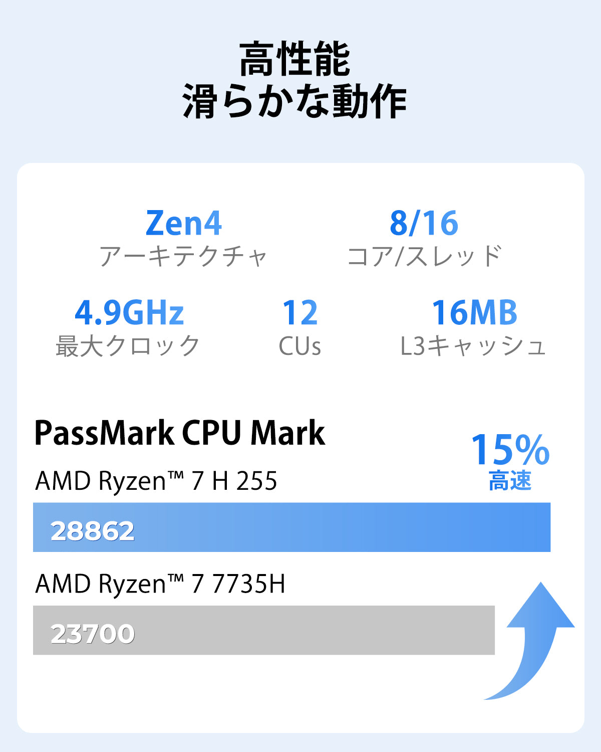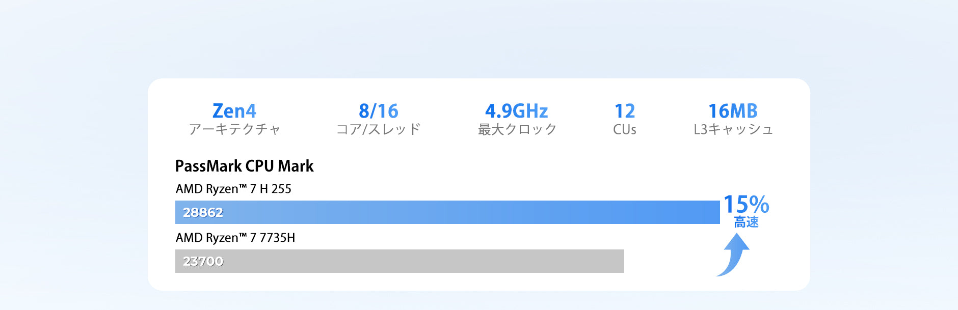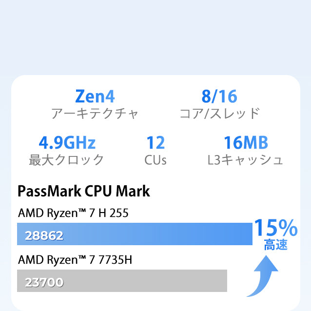 | プロセッサー | AMD Ryzen™ 7 H 255 プロセッサー、8コア / 16スレッド、Zen4アーキテクチャ、TSMC 4nmプロセス、16MB L3キャッシュ、基本クロック3.8GHz、最大ブースト4.9GHz(NPU非搭載) |