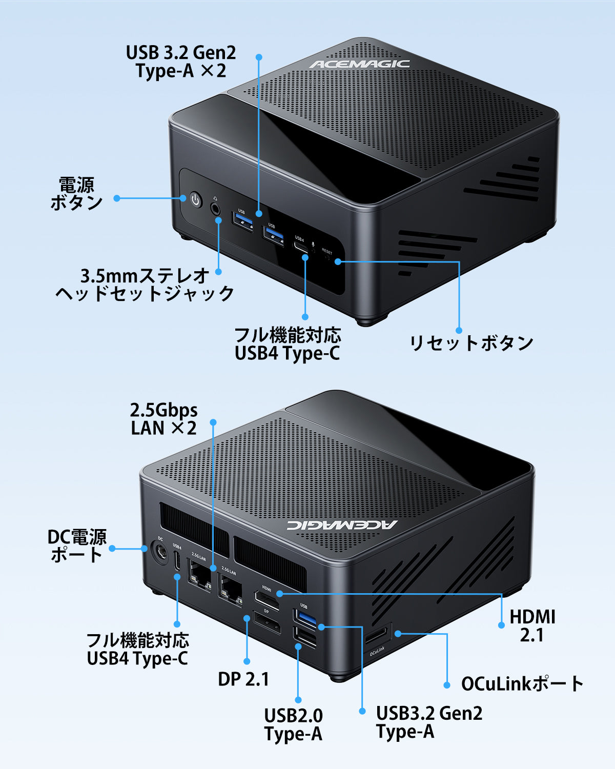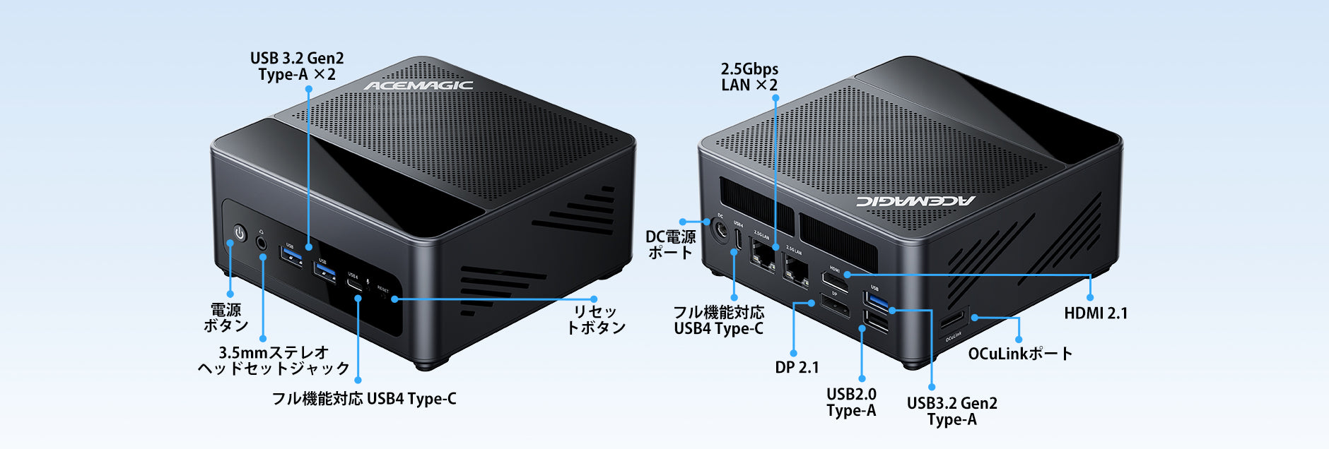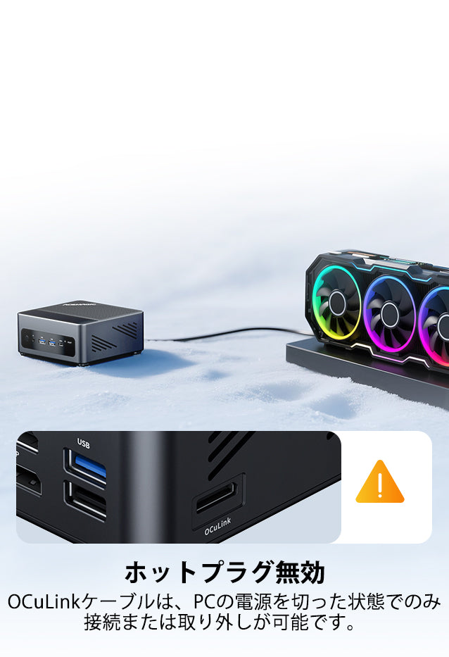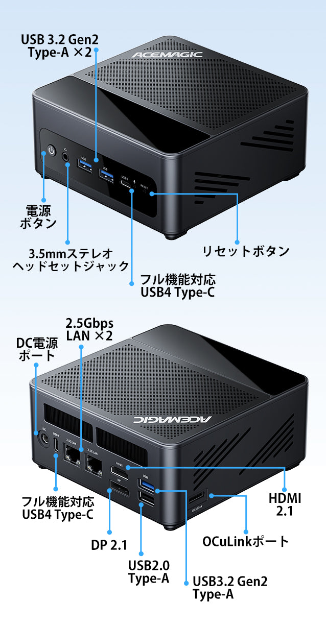 USB 3.2 Gen2 Type-A ×2(前面) USB 3.2 Gen2 Type-A ×1(背面) USB 2.0 ×1(背面) USB4 Type-C ×2(最大40Gbps / DP1.4 / PD対応) HDMI 2.1 ×1 DP 2.1 ×1 RJ45(2.5Gbps)×2 OCuLinkポート ×1(外付けGPU対応) 3.5mmオーディオジャック ×1 DC入力 ×1 |