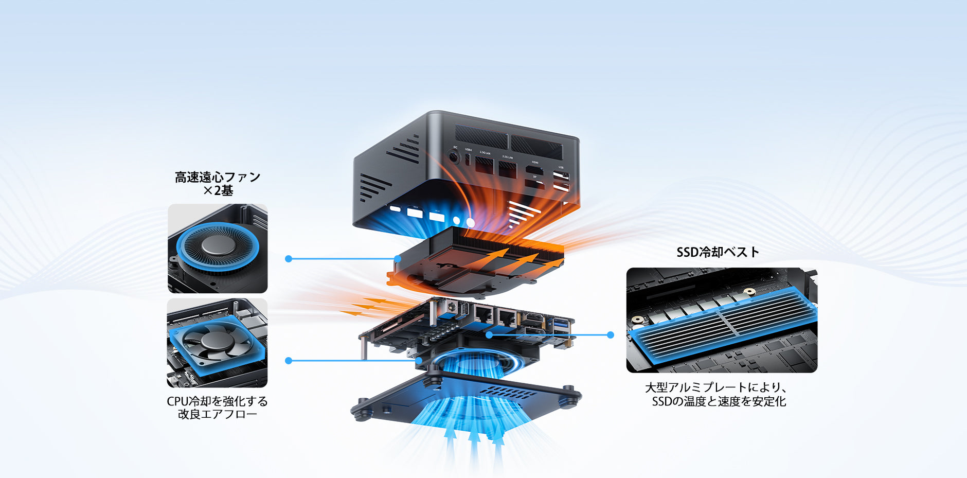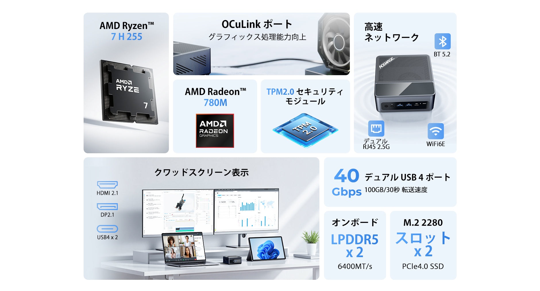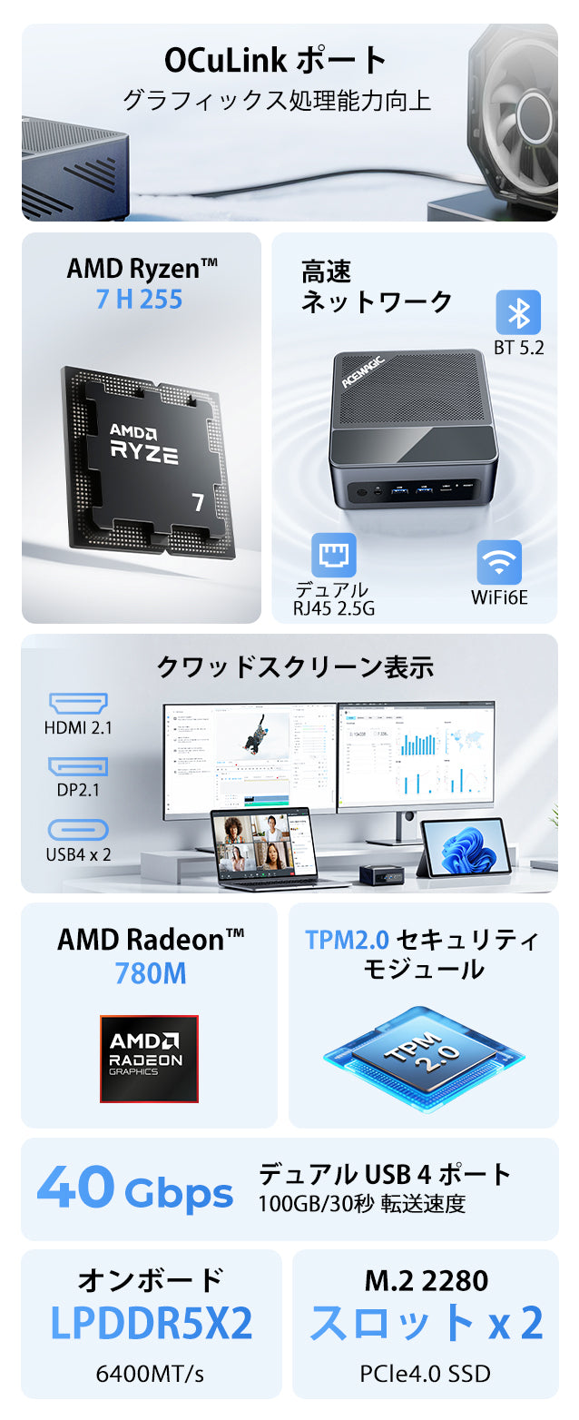 ① OCuLinkポート搭載により、外付けGPU接続に対応 ② デュアルファン(CPU + システム)+ VC均熱板による高効率冷却、最大65Wの性能発揮 ③ 底面カバー取り外し可能で、SSDの増設が容易 ④ 最大4画面出力対応でマルチタスクを効率化 ⑤ 最新Ryzen 7 200シリーズCPU搭載で高性能を実現 ⑥ 2.5GbpsデュアルLANで高速かつ安定したネットワーク ⑦ USB4 Type-Cポート×2搭載で高速データ転送と拡張性を強化 |