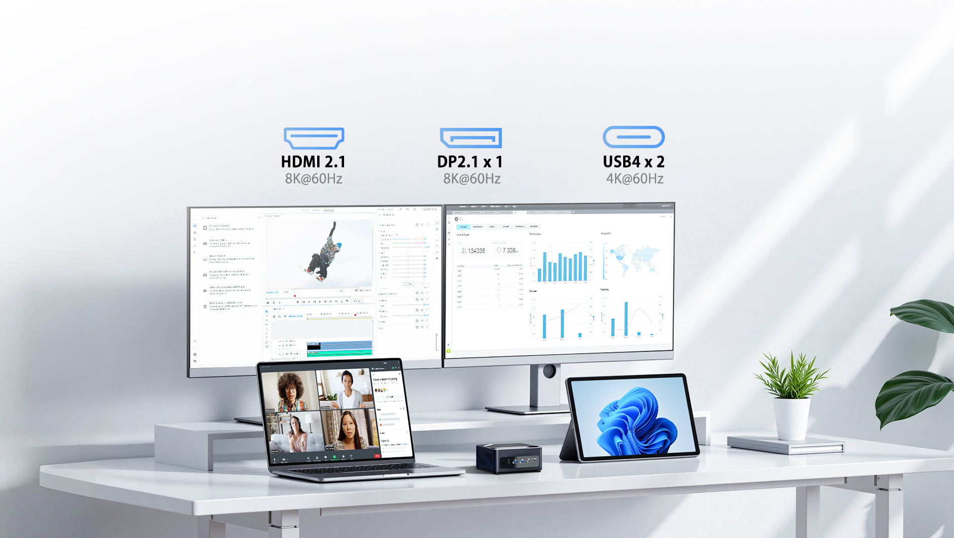 HDMI 2.1・DP2.1・USB4により最大4ディスプレイ接続可能。