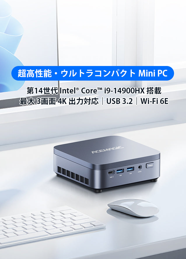 Intel® Core™ i9-14900HX(24コア32スレッド)を搭載し、最大55Wの高性能を発揮。32GB DDR4と1TB NVMe SSDを内蔵し、3画面同時4K出力に対応。超小型ボディに豊富なI/Oと強力冷却を備え、Win11 Proを標準搭載。