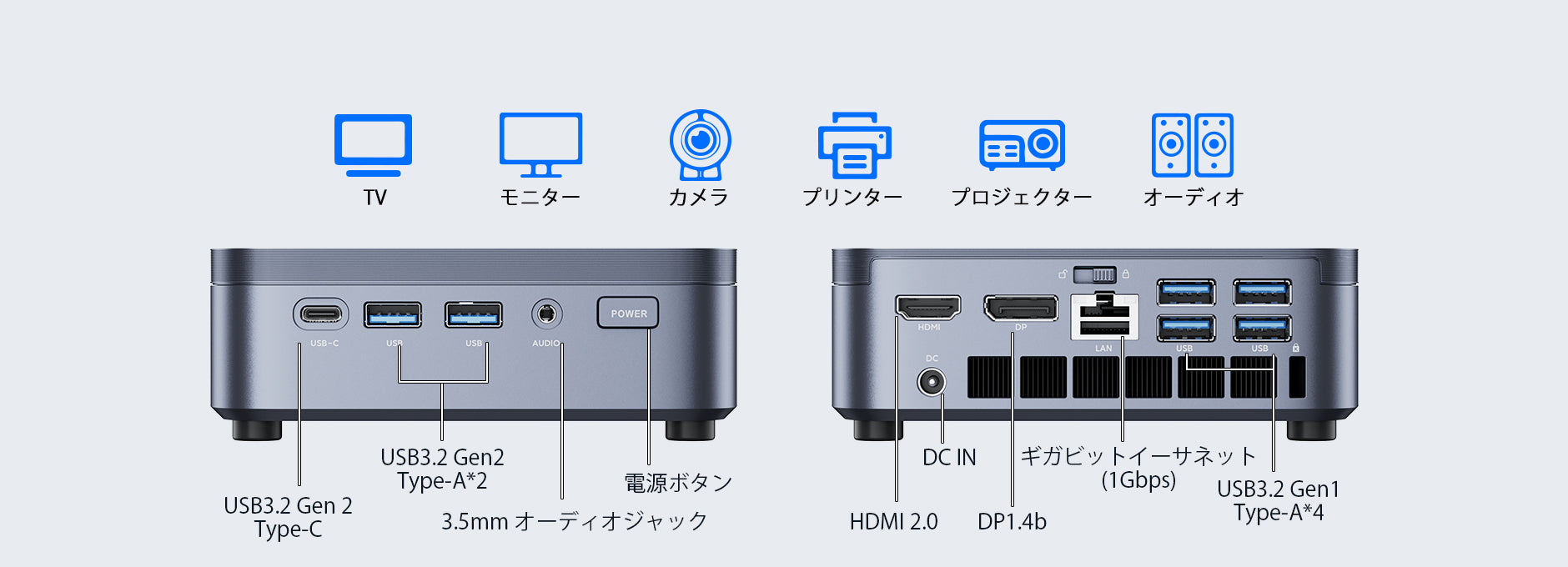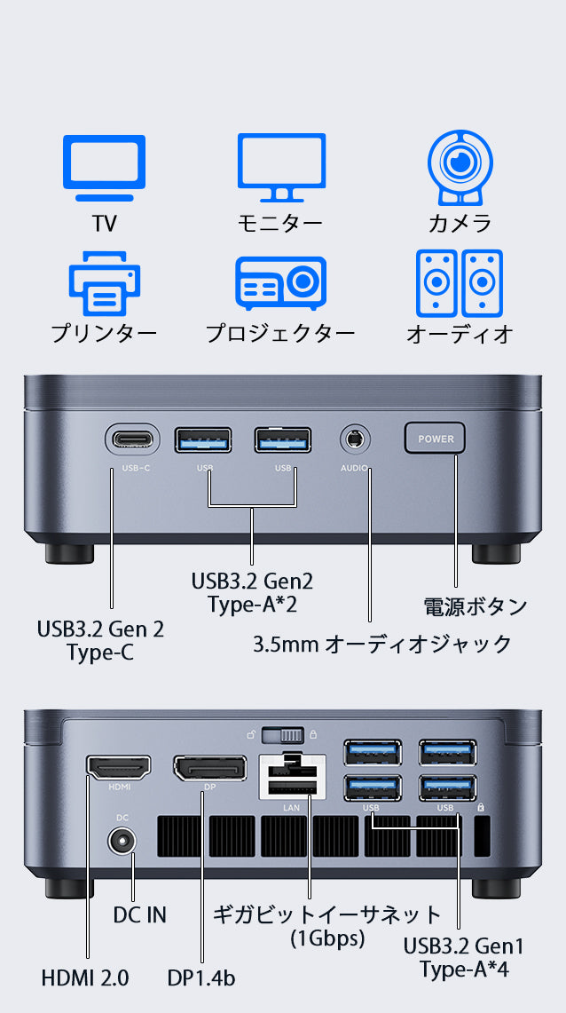 USB-A/C 前後合計7ポート、HDMI 2.0、DP1.4b、3.5mm オーディオジャック、DC 電源口、電源ボタン完備。オフィスや外部デバイス接続に対応。