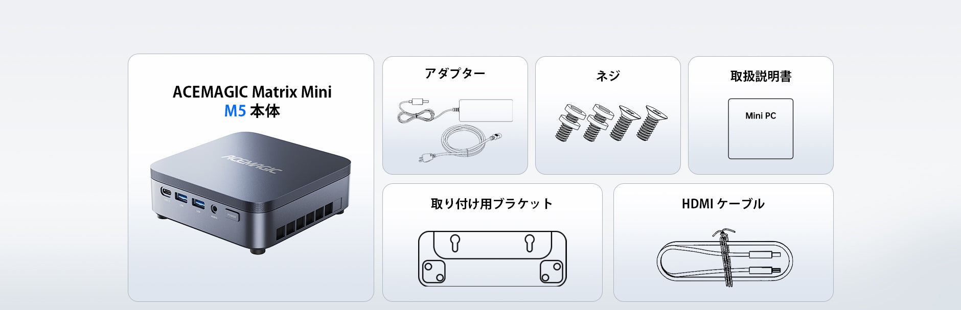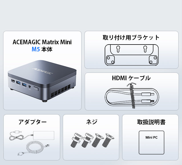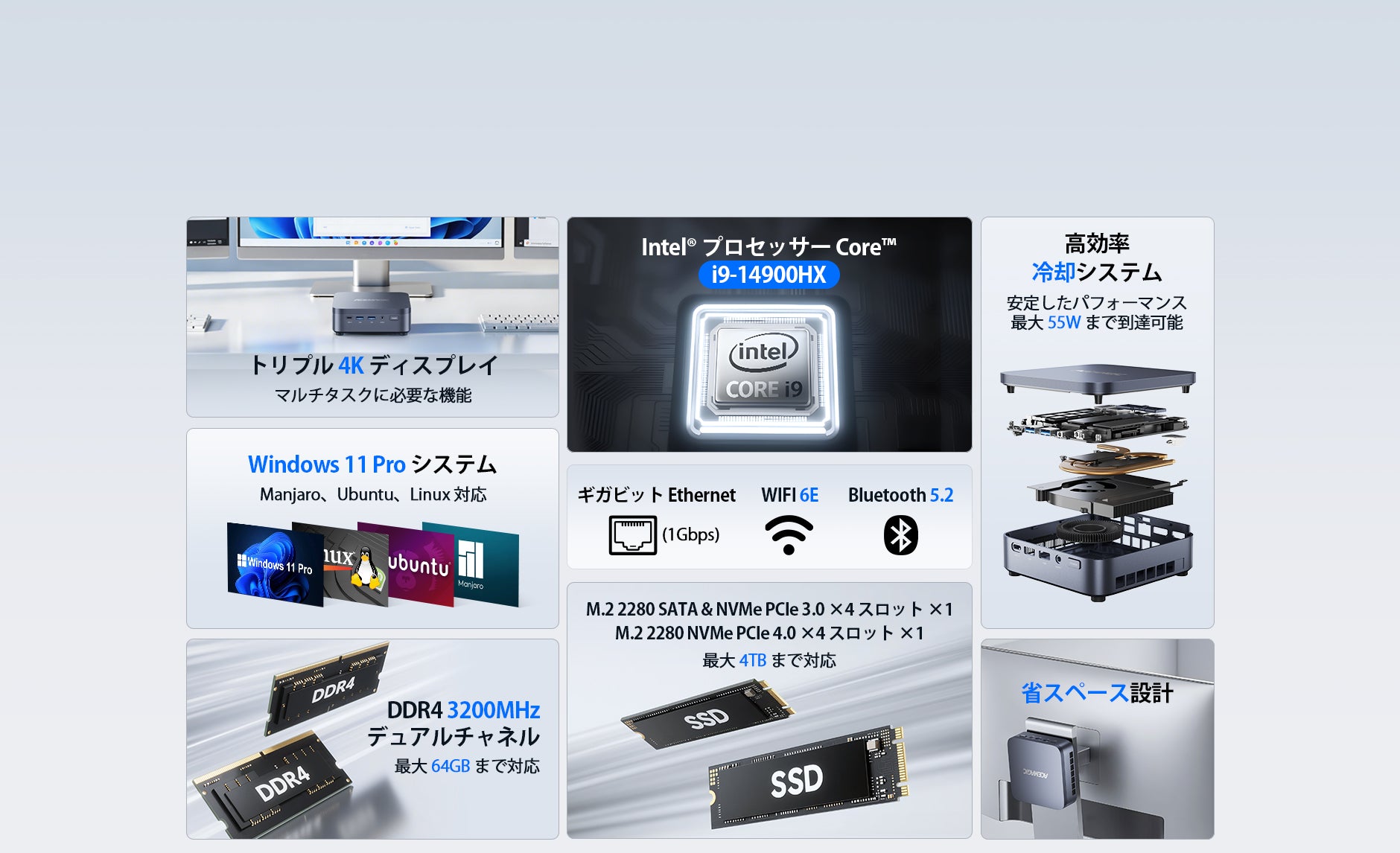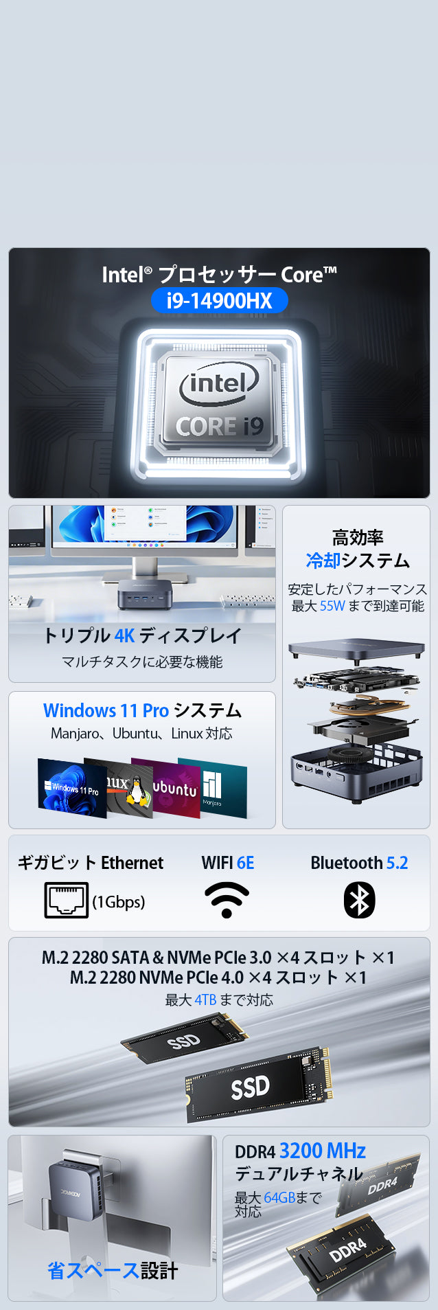 Matrix Mini 薄い青 Intel 第14世代 i9-14900HX フラッグシップモバイルCPU、最大55W性能解放 3画面4K表示対応、Ultra-Compact デザイン、豊富なI/Oインターフェース 標準付属品: 本体、マニュアル、HDMIケーブル、マウント、ネジ、ACアダプター DDR/SSDのクイックスワップ拡張対応 |