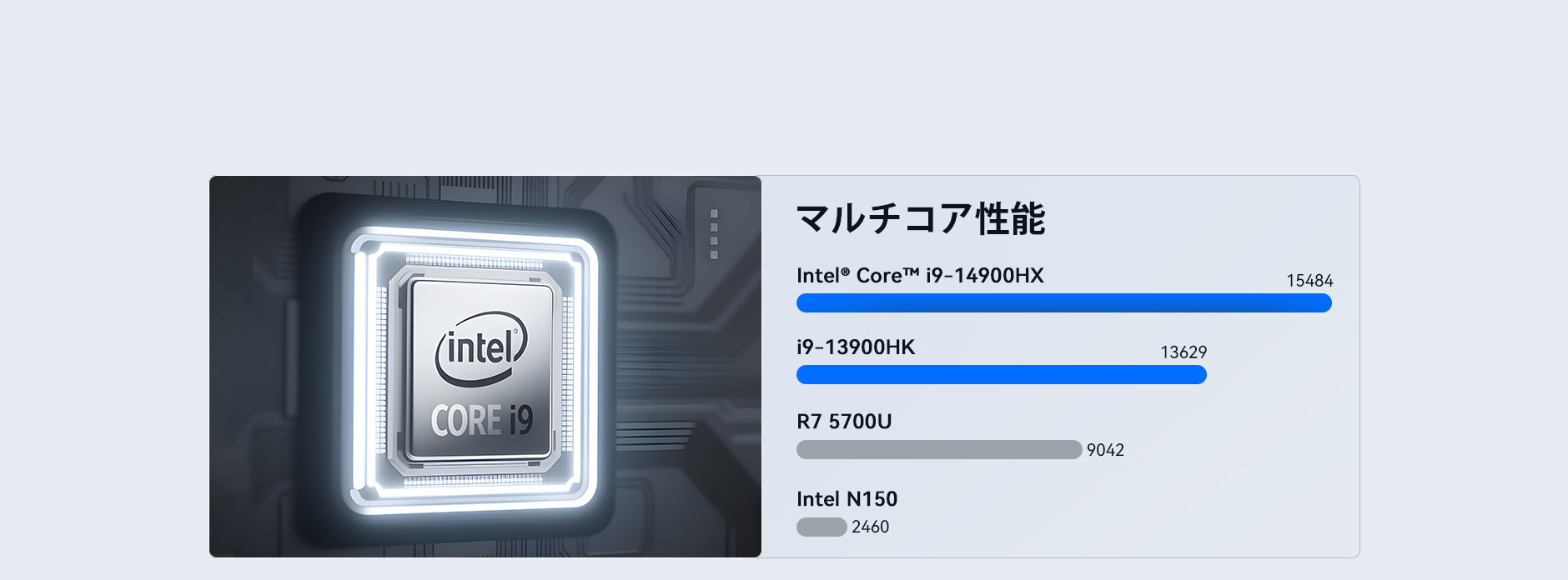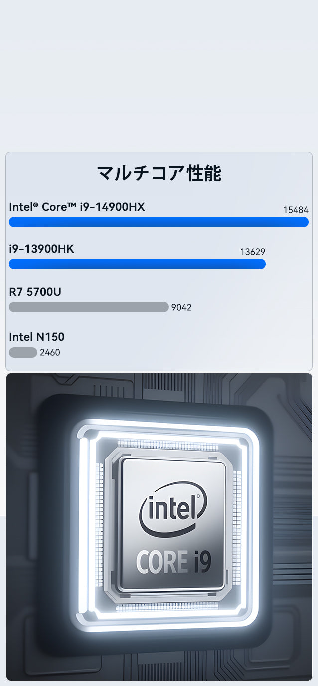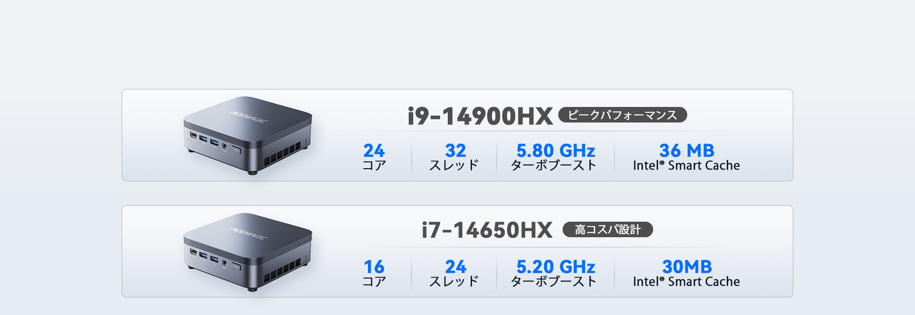 Matrix Mini は Intel® Core™ i9-14900HX 搭載、24 コア(8P+16E)/32 スレッド、基準 2.2GHz、最大ターボ 5.8GHz、最大 55W性能解放。