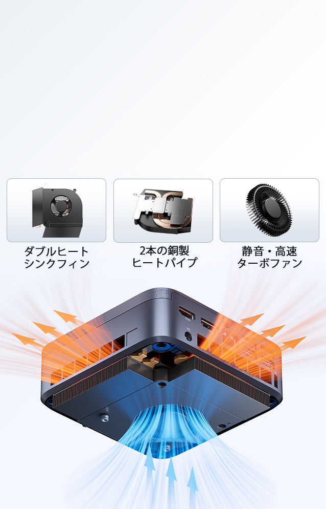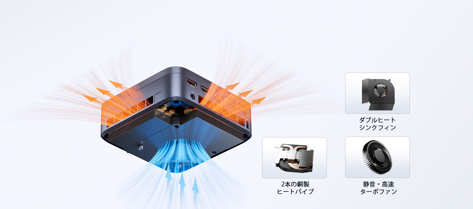 新型デュアルエアフロー冷却システム搭載。デュアル高回転静音ファン + デュアル銅管 + デュアル銅フィンで CPU と SSD を効率的に冷却。