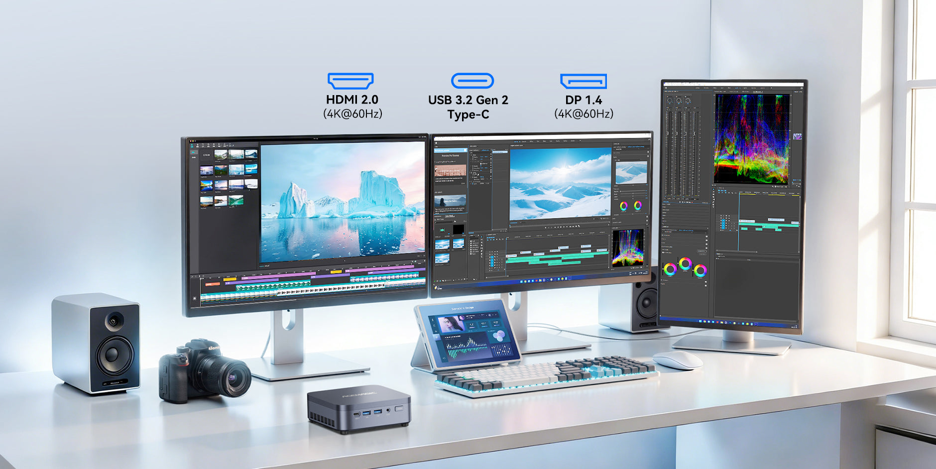 3画面4K表示対応。日常オフィス作業、動画再生、軽度グラフィックデザインもスムーズに動作します。